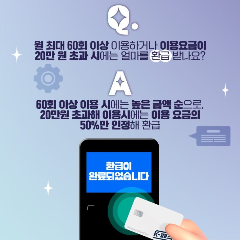 ▶ K-패스 : 전국 지하철, 광역버스, 시내버스, 마을버스, GTX에서 이용 가능하며 요금의 20~53% 환급