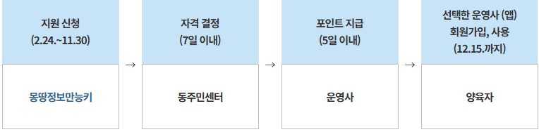 신청 시 2개 업체 중 원하는 업체를 선택해서 신청하면 됩니다. 동주민센터에서 7일 이내 자격을 확인·결정하면 선택한 운영사에서 5일 이내(영업일 기준) 신청자에게 포인트를 지급합니다. 신청 후 12일 정도 소요되며, 실제 탑승은 3월 4일부터 가능합니다.
