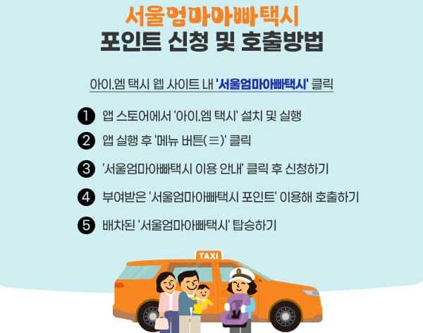 * 신청 방법 : 구글 및 앱스토어에서 '아이.엠(i.M)' 설치(운영사 앱) → 아이.엠(i.M) 회원가입 → '서울엄마아빠택시' 메뉴 → 자치구 자격 결정 → 승인 시 서비스 이용(계정 내 포인트로 결제)