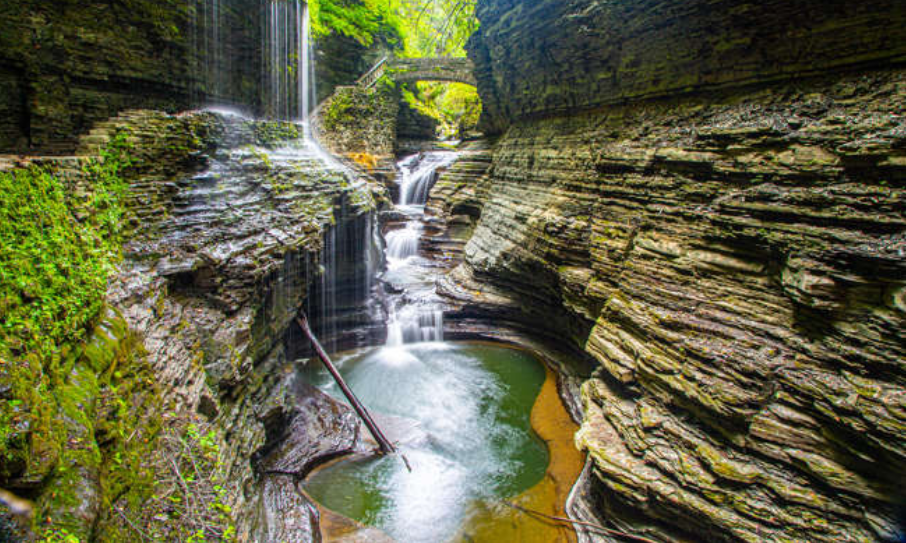 사진 속에서와 같이 험준한 협곡을 포함하는 3.2km 길이의 트레일을 중심으로 하는 왓킨스글렌 주립공원은 뉴욕주 북부의 세네카호 바로 남쪽에 있는 삼림 보호 구역입니다.