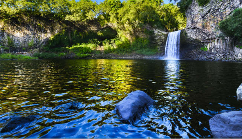 많은 지역에 이끼로 덮인 산, 울창한 숲, 수백 개의 폭포가 가득합니다. 이 사진은 절벽 위로 폭포처럼 쏟아지는 데 로슈 강이 물을 공급하는 수영장인 배생 드라 페의 모습입니다.