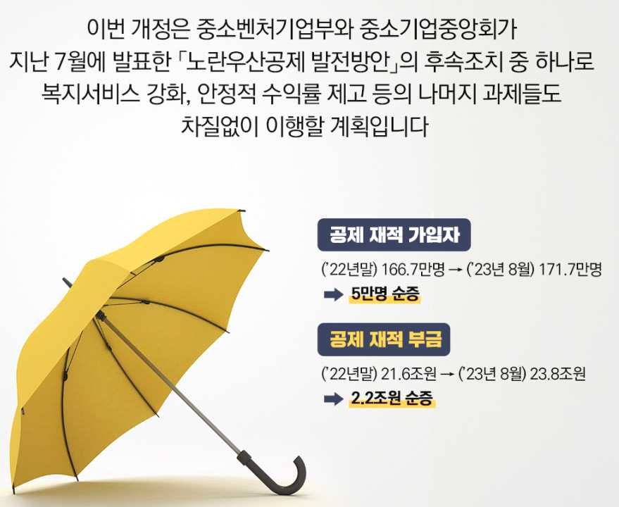 1) 중소벤처기업부는 노란 우산공제의 공제항목 확대 및 중간정산 제도 도입을 위해 「중소기업협동조합법 시행령」 일부개정안을 입법 예고(10.23~12.2, 40일간)