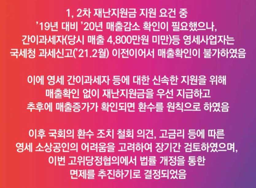 - 1, 2차 재난지원금 지원 요건 중 2019년 대비, 2020년 매출 감소 확인이 필요했으나, 간이 과세자(당시매출 4,800만 원 미만) 등 영세사업자는, 국세청 과세 신고(2021년 2월) 이전이어서 매출 확인 불가