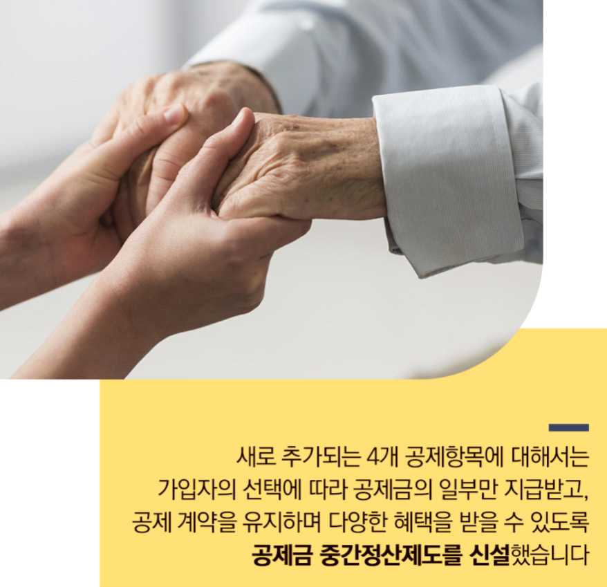 4) 새로 추가되는 4개 공제항목에 대해서는 가입자의 선택에 따라 공제금의 일부만 지급받고, 공제 계약을 계속 유지하며 노란 우산공제의 다양한 혜택을 받을 수 있도록 공제금 중간정산제도를 신설