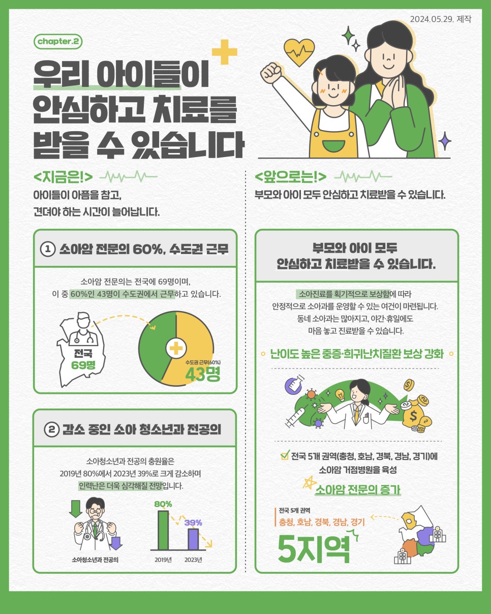 이로 인해 동네 소아과는 많아지고, 야간·휴일에도 마음 놓고 진료를 받을 수 있습니다. 중증·희귀 난치질환 진료 환경도 더욱 개선될 수 있습니다.