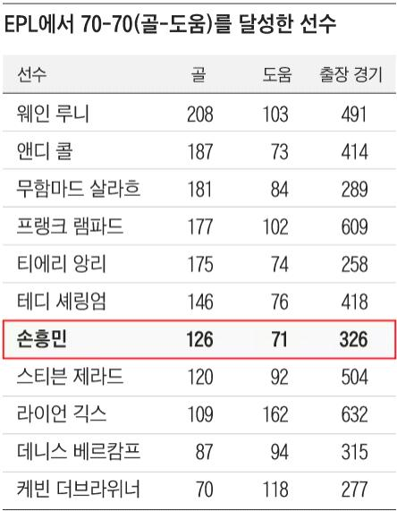 EPL 통산 손흥민은 326경기 126골 71 도움을 기록 중입니다. 웨인 루니(208골 103 도움), 프랭크 램파드(177골 102 도움), 라이언 긱스(109골 162 도움), 티에리 앙리(175골 74 도움) 등 11명이 도달한 '70-70 클럽'에 이름을 올렸습니다.
