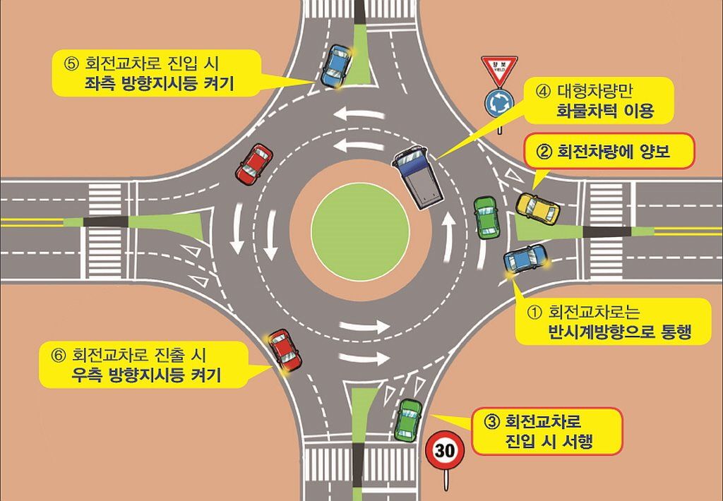 모든 회전 교차로는 반시계 방향으로 돌아야 합니다. 회전 교차로를 진입할 때 핸들을 왼쪽으로 틀면 왼쪽 방향 지시등, 빠져나갈 때에는 반대로 오른쪽 방향지시등을 켜야 합니다.