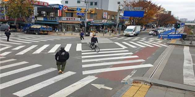 횡단보도 앞에는 정지선이 그어져 있는데, 정지선은 신호 대기를 할 때 선 안쪽으로 넘어오지 말라는 의미입니다.