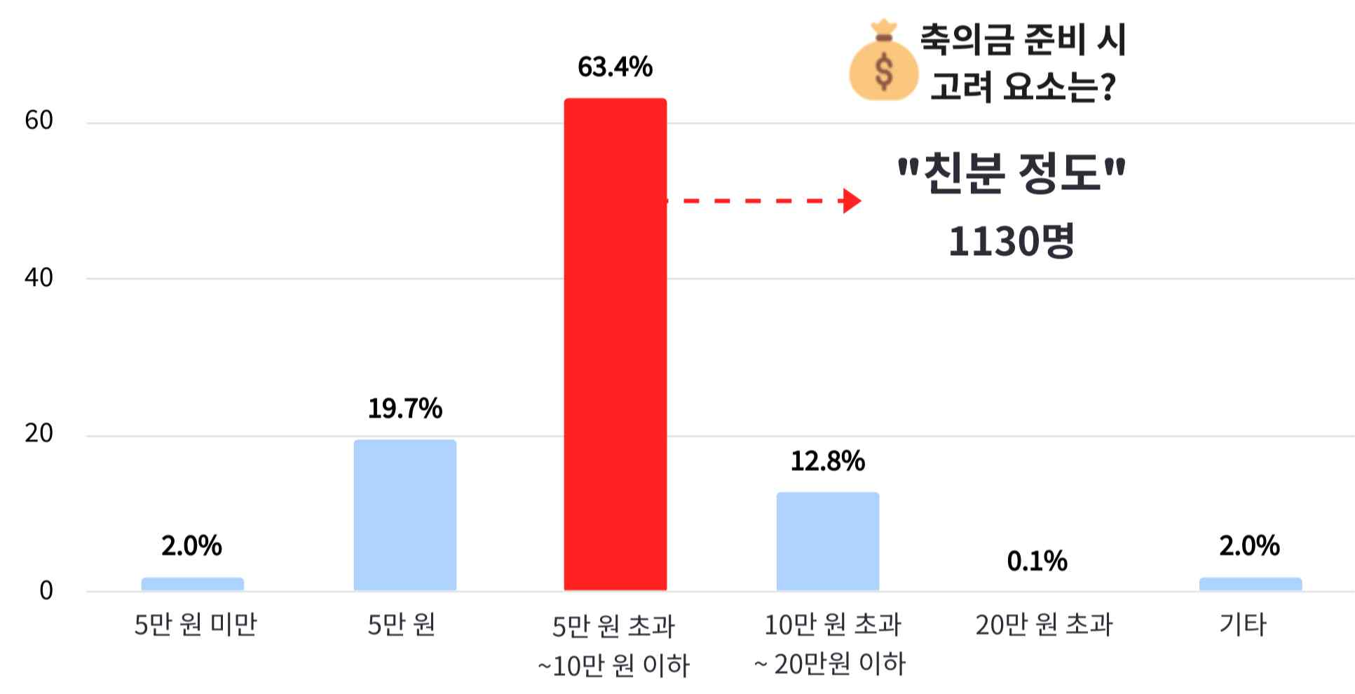 축의금의 액수를 결정할 때 가장 중요한 기준으로는 '신랑·신부와의 친분 정도(1,130명)', 즉, 관계의 깊이인 것으로 나타났습니다.