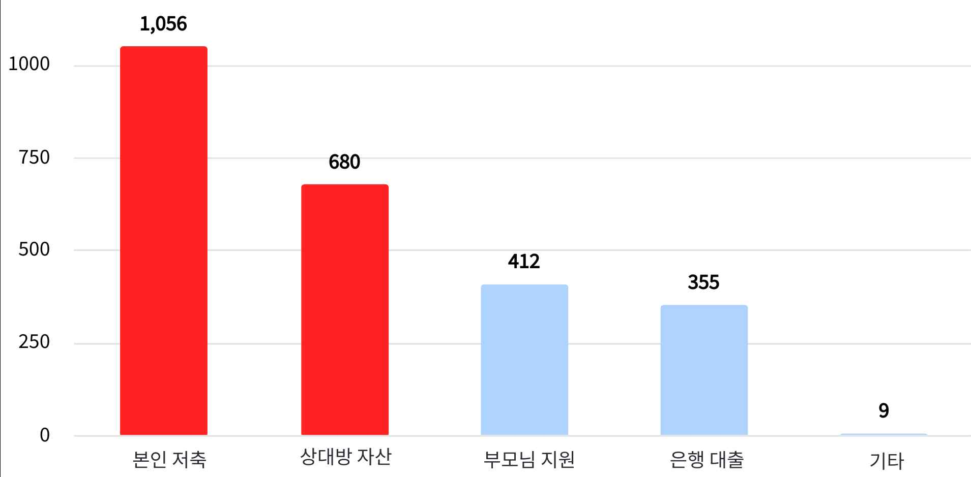 먼저, 결혼 준비에 필요한 자금을 어디에서 조달하는지 중복 선택이 가능하도록 질문한 결과, 많은 MZ세대가 '본인 저축(1,056명)', '상대방 자산(680명)'을 주된 자금 조달 방법으로 생각하고 있다고 답했습니다. 결혼 준비 과정에서도 경제적 자립심과 독립적인 태도가 드러나는 대목이라 할 수 있습니다.