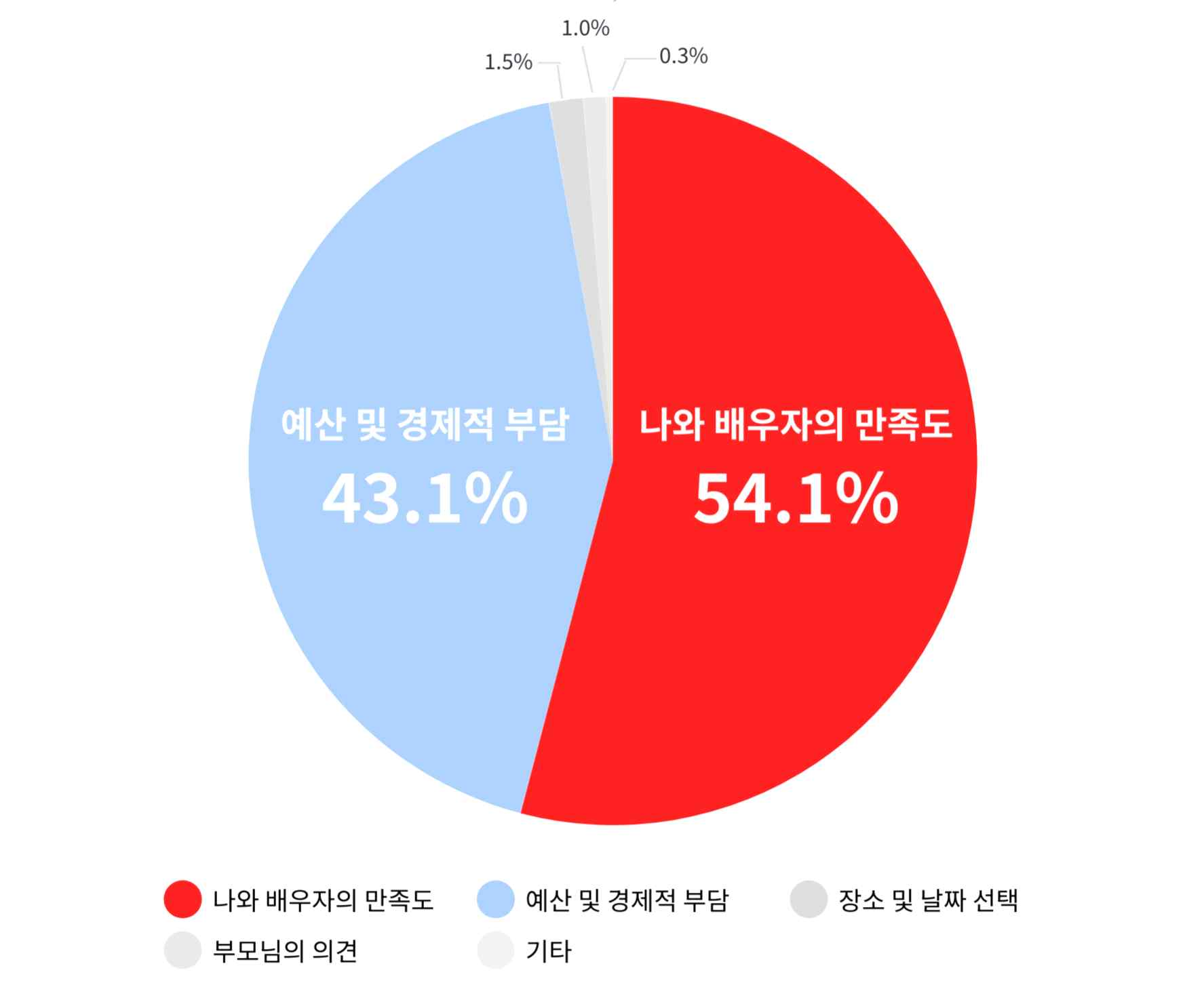 설문조사 결과, '나와 배우자의 만족도가 54.1%', '예산 및 경제적 부담이 43.1%'로 거의 반반씩 차지하여 가장 중요한 조건으로 꼽혔습니다.