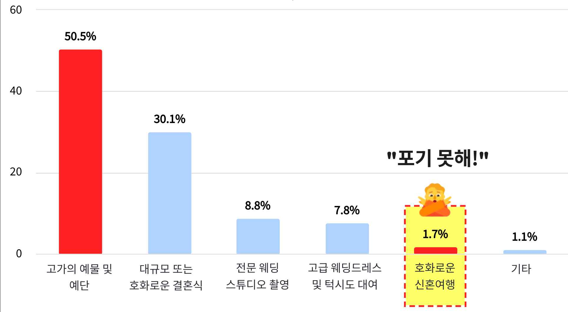 '부모님의 의견(1%)'이나'장소 및 날짜(1.5%)'와 같은 전통적인 요소들보다, 개인의 의견과 만족도가 더 중시되었다는 점에서 MZ세대가 독립적이고 자율적인 결혼 준비를 선호한다는 것을 알 수 있었습니다.