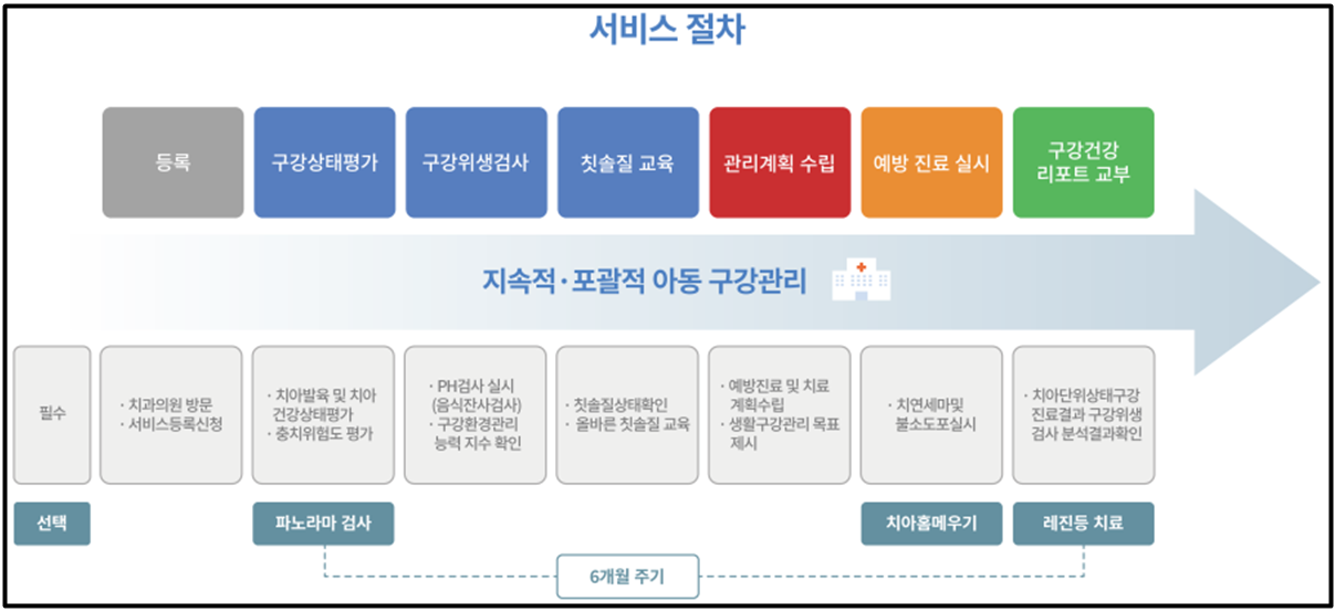 연 1회는 기본서비스로 실시하고, 충치 위험군으로 분류된 아동은 매회(최대 3년간 6회) 실시하여 선별 적용