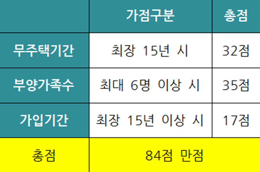 앞서 말했듯이 가점제와 추첨제 방식으로 선정합니다. 먼저 가점제 신청자들 중 아래 표에 따라 총점이 높은 순으로 당첨자를 선정하고 → 가점제 탈락자와 추첨제 신청자를 한데 모아 추첨하는 것입니다.