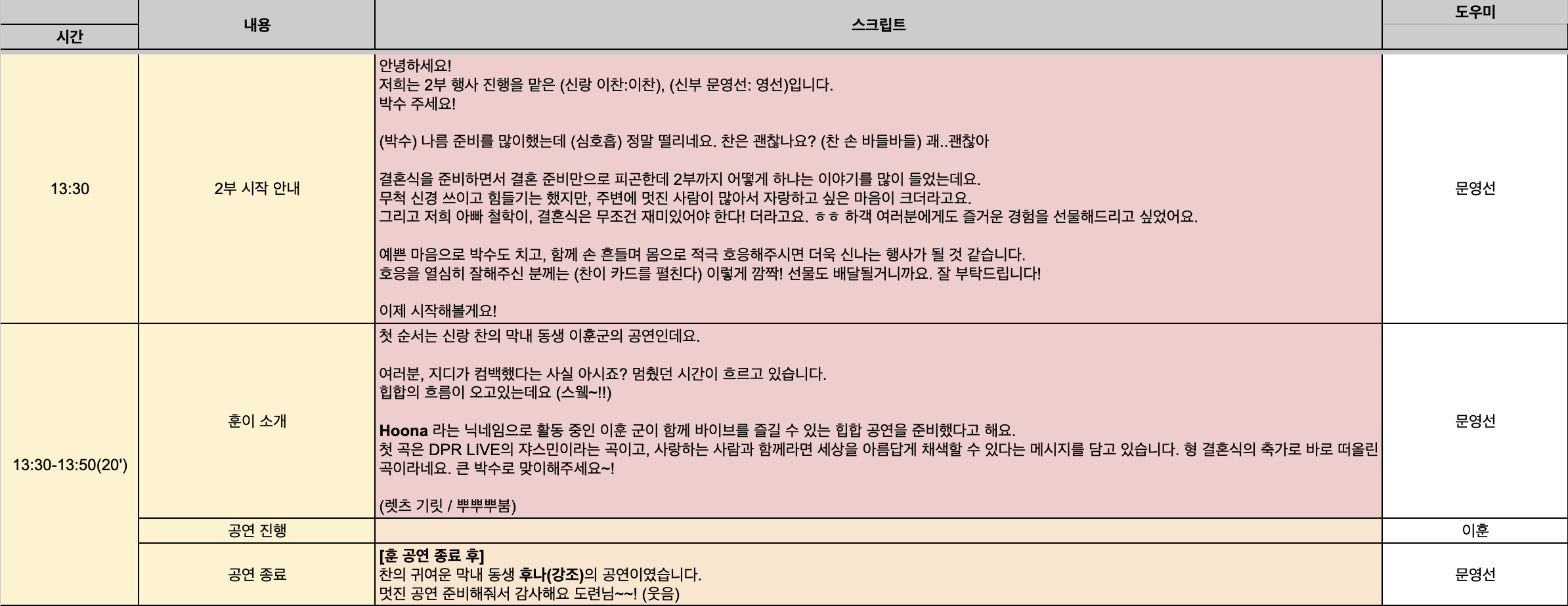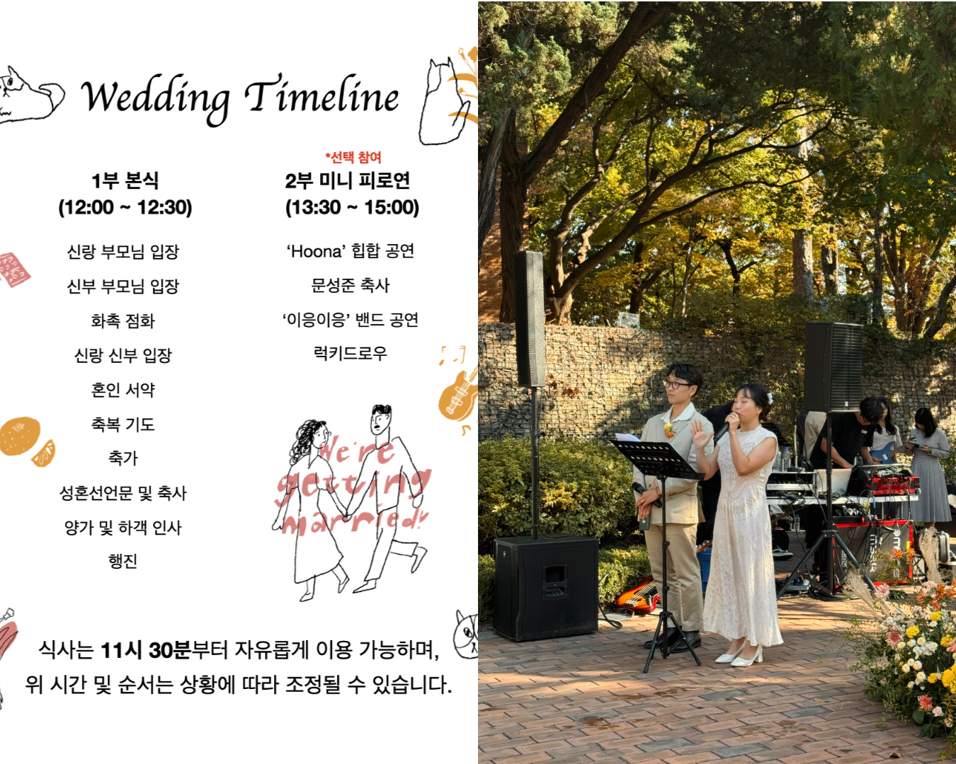 중간 휴식 덕분에 하객분들이 각 순서에 더 집중해 주셨고, 자연스럽게 피로연 분위기로 이어갈 수 있었습니다.