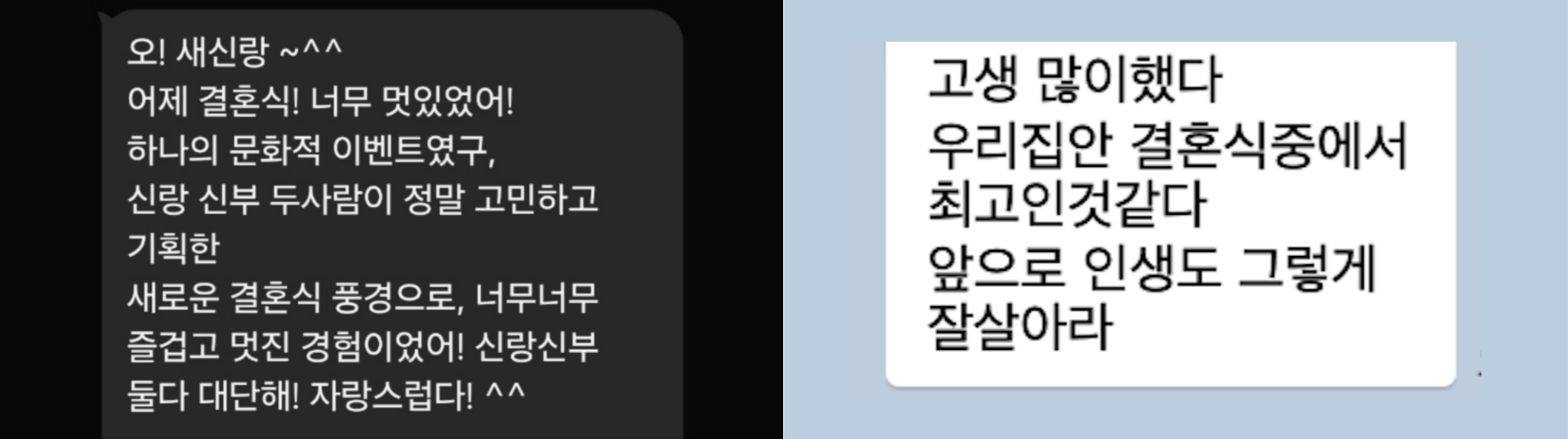 무엇보다 어른들의 칭찬 일색! 친구들도 지금껏 참석한 결혼식 통틀어 가장 즐거웠다고 입을 모아 후기를 남겨줬습니다. 제가 경험한 나만의 결혼식 꿀팁, 오늘 잔뜩 알려드리겠습니다.