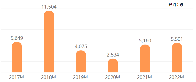 식품의약품안전처가 제공하는 자료에 따르면, 2022년 식중독 환자 수는 5,501명입니다. 식중독 환자 수는 2018년 이후 2020년까지는 감소하는 추세였다가 다시 증가하는 모습을 보여주고 있습니다.