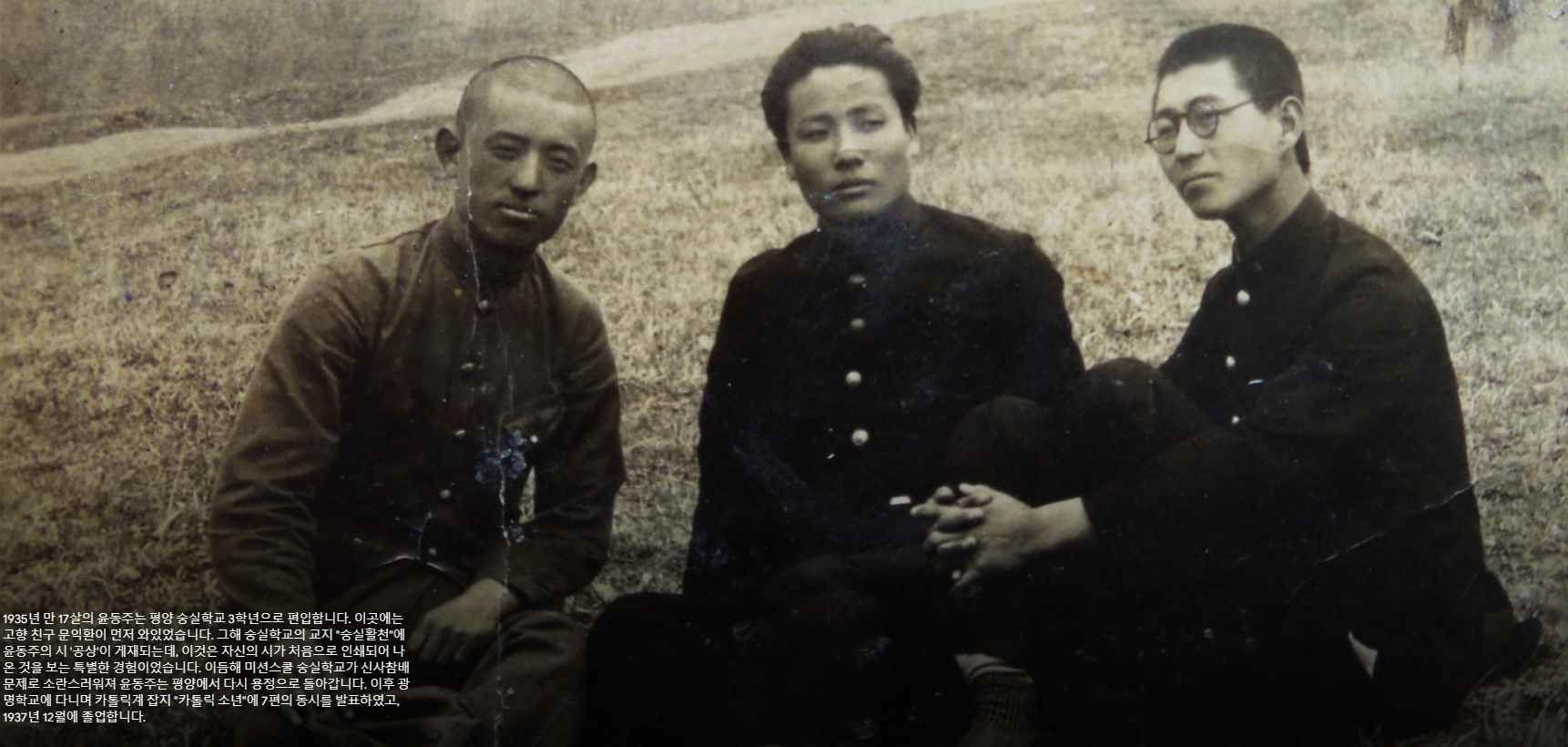 1932년 용정으로 이사한 윤동주는 만 14세에 송몽규, 문익환과 함께 은진중학교에 입학합니다. 그는 동기들과 교내 문예지를 만들고, 축구선수로도 뛰고, 교내 웅변대회에서 1등도 하는 적극적이고 활달한 소년이었습니다.