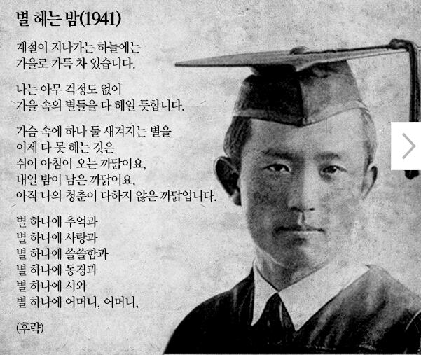 가슴속에 하나 둘 새겨지는 별을 이제 다 못 헤는 것은 쉬이 아침이 오는 까닭이요,