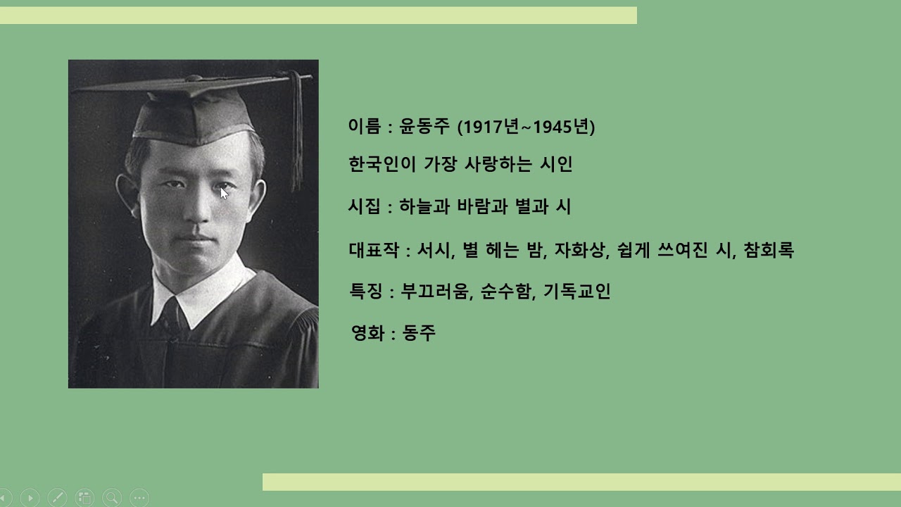 윤동주(尹東柱, 1917-1945)는 한국인이 가장 사랑하는 시인으로 어려운 식민지 상황에서도 문학을 통해 꼿꼿이 시대와 삶의 방향성을 모색했습니다.