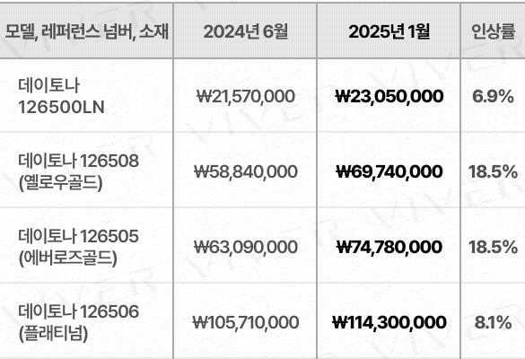 예를 들어, 롤렉스 데이토나 126508 골드 모델은, 지난해 6월에 5,884만 원이었던 가격이 반년 만에 18.5%나 인상되어 6,974만 원이 됐습니다. 하룻밤 새에 무려 1,000만 원 가까이 상승한 것입니다.