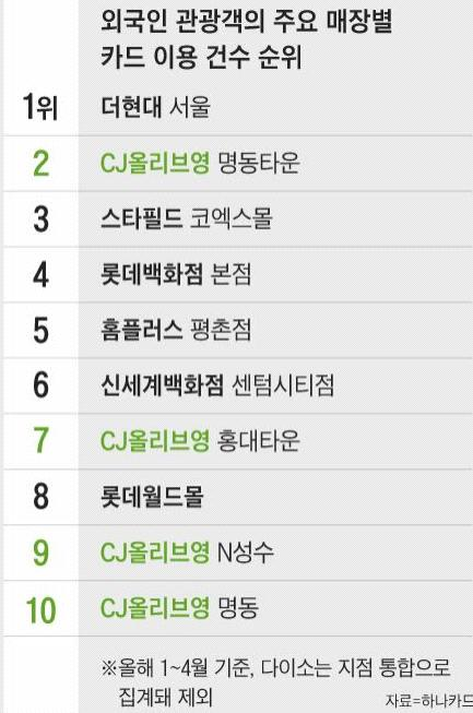 하나카드가 올해 1~4월 외국인들이 국내에서 결제한 카드 이용 내역을 분석한 결과, 유통 업종 이용 건수 상위권에 올리브영의 각 지점이 대거 이름을 올렸습니다.