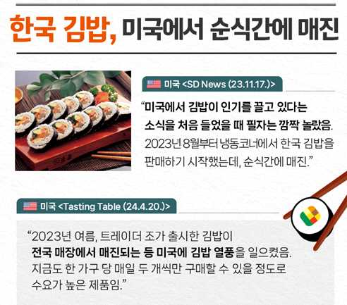 - 미국에서 김밥이 인기를 끌고 있다는 소식을 처음 들었을 때 필자는 깜짝 놀랐음. 2023년 8월부터 냉동코너에서 한국 김밥을 판매하기 시작했는데, 순식간에 매진.