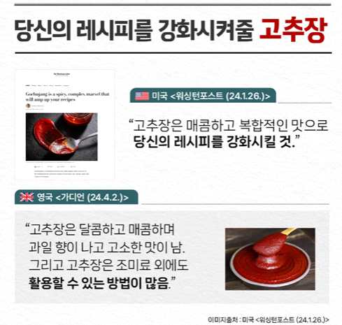 - 고추장은 매콤하고 복합적인 맛으로, 당신의 레시피를 강화시키는 데 사용. 미국과 영국에서도 고추장을 활용하는 방법이 많이 소개됨.