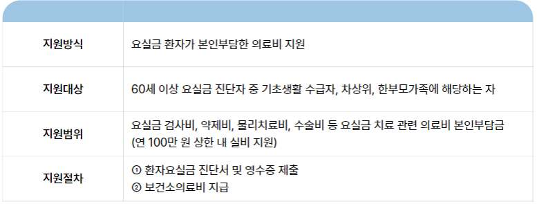 60세 이상 요실금 진단자 중 저소득층(기초생활수급자, 차상위 등)을 대상으로, 연 100만 원 범위 내에서 요실금 관련 의료비 본인부담금을 지원합니다.