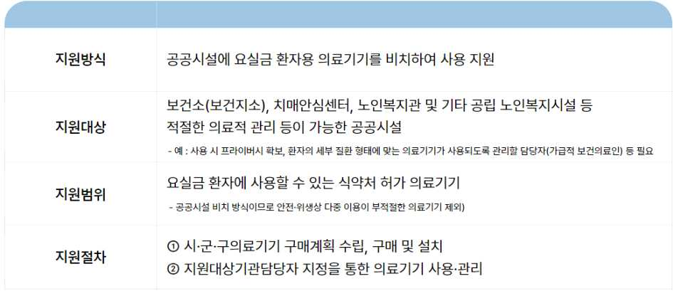 보건소, 치매안심센터, 노인복지관 등 노인 접근성이 좋은 공공시설을 중심으로 식품의약품안전처 허가 의료기기를 비치해, 환자가 인근 시설을 방문해 편하게 의료기기를 사용할 수 있도록 지원합니다.