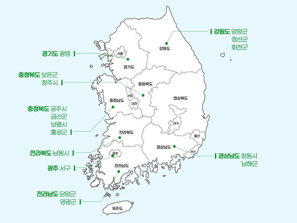 광주광역시 서구, 경기도 광명시, 강원특별자치도 양양군·정선군·화천군, 충북 보은군·청주시, 충남 공주시·금산군·보령시·홍성군, 전북 남원시, 전남 담양군·영광군, 경남 창원시·남해군입니다.