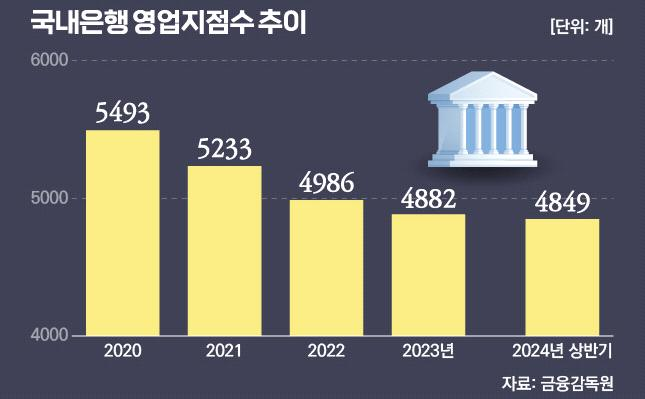 금융감독원에 따르면 국내 은행 점포는 2019년 말 6,738개에서 2020년 말 6,427개, 2021년 말 6,121개, 2022년 말 5,831개, 2023년 말 5,747개, 지난해 10월 말 5,690개로 감소했습니다.