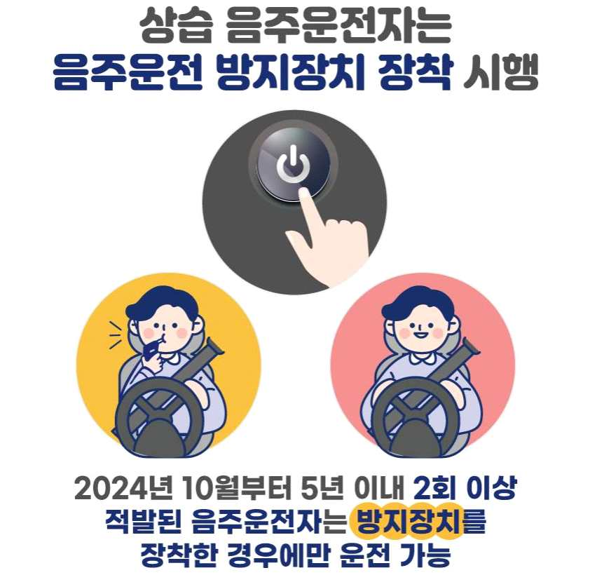 - 2024년 10월부터 5년 이내 2회 이상 적발된 음주 운전자는, 방지 장치를 장착한 경우에만 운전 가능