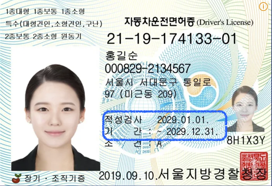 운전면허 갱신 및 적성검사 확인 방법은 아주 간단합니다. 운전면허증 전면의 하단부를 보면 적성검사 기간이 명시돼 있습니다.