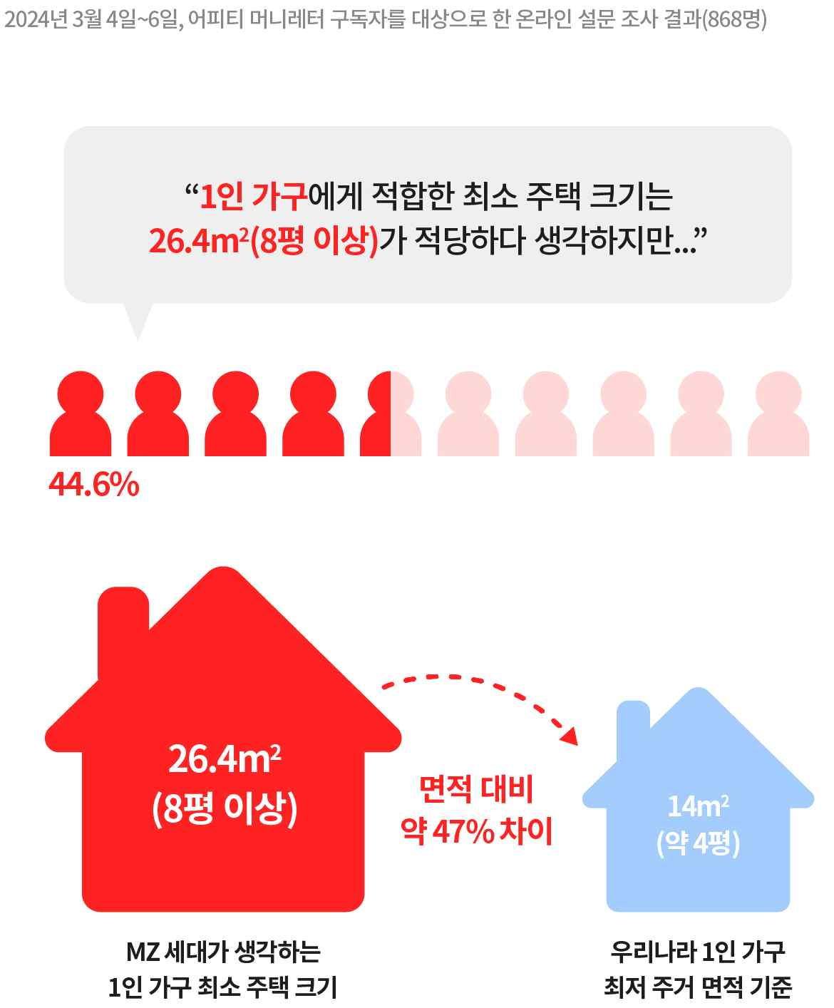 1인 가구에 적합한 최소 주택 크기에 대한 질문에 대해서는, 26.4㎡(약 8평 이상) 크기를 선호하는 참여자가 44.6%로 가장 많았고, 이어서 33㎡(약 10평 이상)를 선호한다는 응답이 33.6%로 나타났습니다.