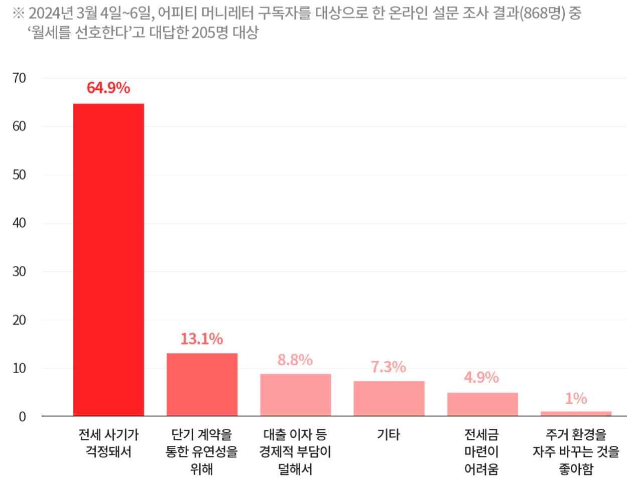 한편, 월세를 더 선호하는 MZ세대에게도 이유를 물었는데, 무려 64.9%가 전세 사기에 대한 두려움 때문에 월세를 선호한다고 답했습니다.