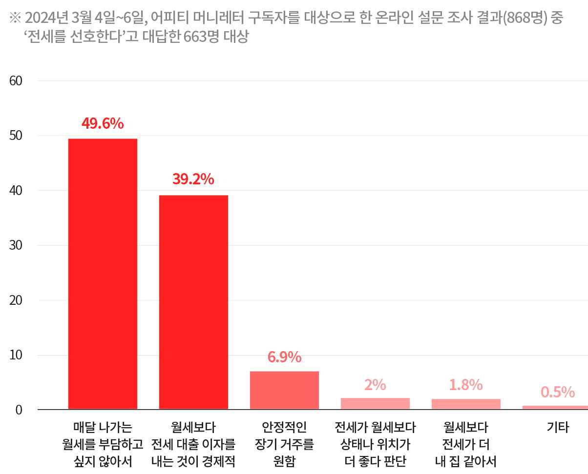 조사 결과에 따르면, MZ세대는 주로 경제적 이유로 전세를 선호했습니다. 설문 참여자의 49.6%는 월세 지출을 원치 않아 전세를 선택한 반면, 39.2%는 전세 대출의 이자가 월세보다 경제적이라고 판단했습니다.