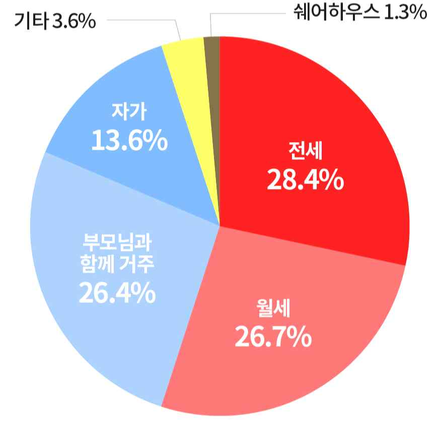 반면, 자신의 집을 소유하고 있는 경우는 13.6%에 불과했는데, 주택 가격의 상승, 낮은 소득과 저축, 대출 규제 등으로 인해 아직 청년들이 주택 소유를 하기에는 높은 장벽이 있다는 것을 보여줍니다.