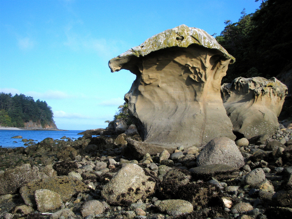 일출 명소로도 유명하며, 애국가 영상 배경으로도 자주 등장합니다. 행남 해안산책로를 따라 걸으면 가까이서 감상할 수 있습니다.버섯바위는 윗부분이 넓고 아랫부분이 좁은 버섯 모양의 바위로, 차별침식에 의해 형성된 독특한 지형입니다.