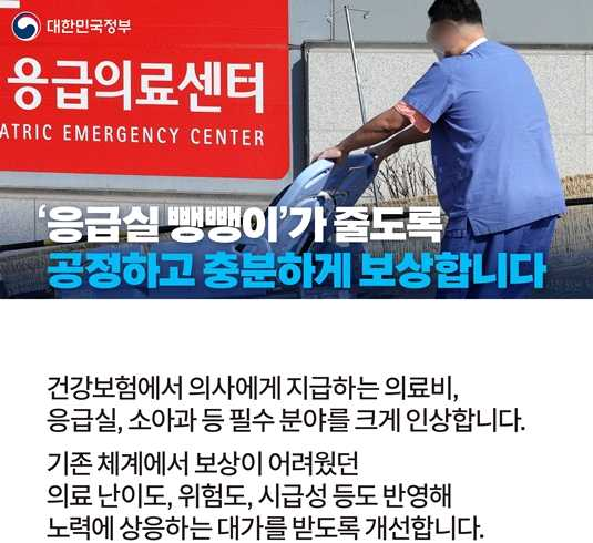 * 건강보험에서 의사에게 지급하는 의료비, 응급실, 소아과 등 필수 분야를 크게 인상합니다.