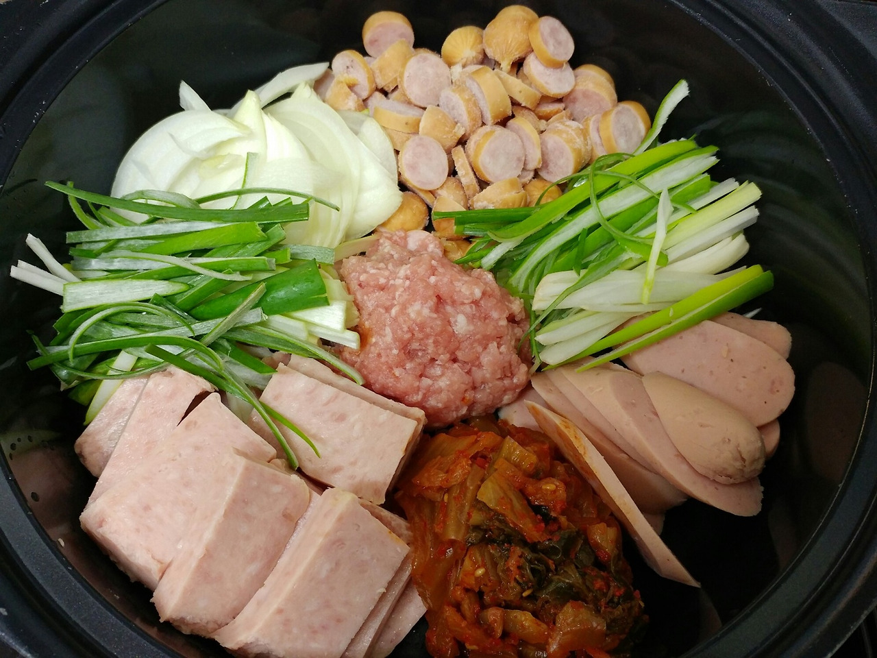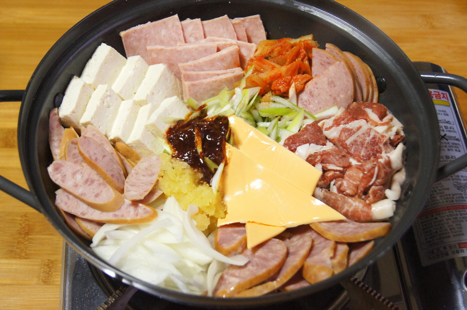 소시지 1팩, 스팸 1캔, 고추장 2큰술, 고춧가루 2큰술, 다진 마늘 1큰술, 간장 3큰술, 설탕 1큰술, 물 600~700ml, 김치 1줌, 양파 1/2개, 파 약간, 고기 or 베이컨(생략 가능) 적당량, 치즈(생략 가능) 1장, 라면 사리(생략 가능)