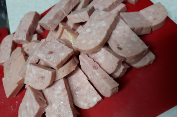 ⑧ 초벌 한 소시지를 건져서 먹기 좋게 썰어 주세요.