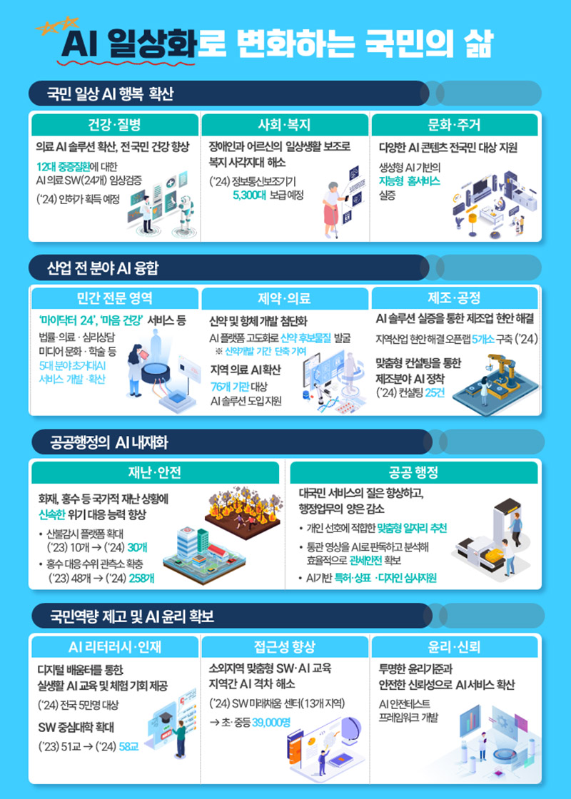 AI와 함께 살아가는 시대를 대비하기 위해 국민의 AI 활용 역량 제고와 AI 윤리 등 안전한 AI 기반 인프라 확충에 2,309억 원을 투입하는 등 13개 과제를 추진