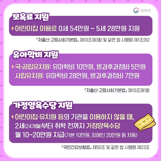 * 어린이집·유치원 등의 기관을 이용하지 않을 때, 2세(24개월)부터 취학 전까지 가정 양육 수당 월 10~20만 원 지급(기본 10만 원, 장애인 20만 원 등 차등)