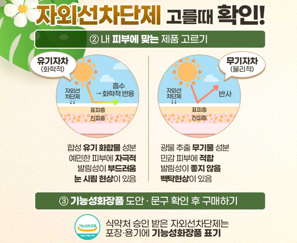또, 자외선 차단제를 구매할 때는, 식약처로부터 '기능성화장품'으로 심사받은 제품인지 꼭 확인하고 구매하시기 바랍니다. 사용할 땐 햇빛에 노출되는 피부에 골고루 바른 후 자주 덧발라주는 것도 잊지 마시고요.