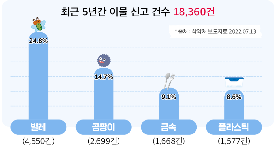 식품의약품안전처가 2022년 발표한 '여름철 벌레·곰팡이 이물 신고 현황'을 살펴보면, 여름철이 포함된 7월부터 10월까지는 온도와 습도가 높아지면서 이물 신고가 많아지는 것으로 나타났습니다. 그중 곰팡이로 인한 신고는 전체 신고의 14.7%로 2위를 차지했습니다.