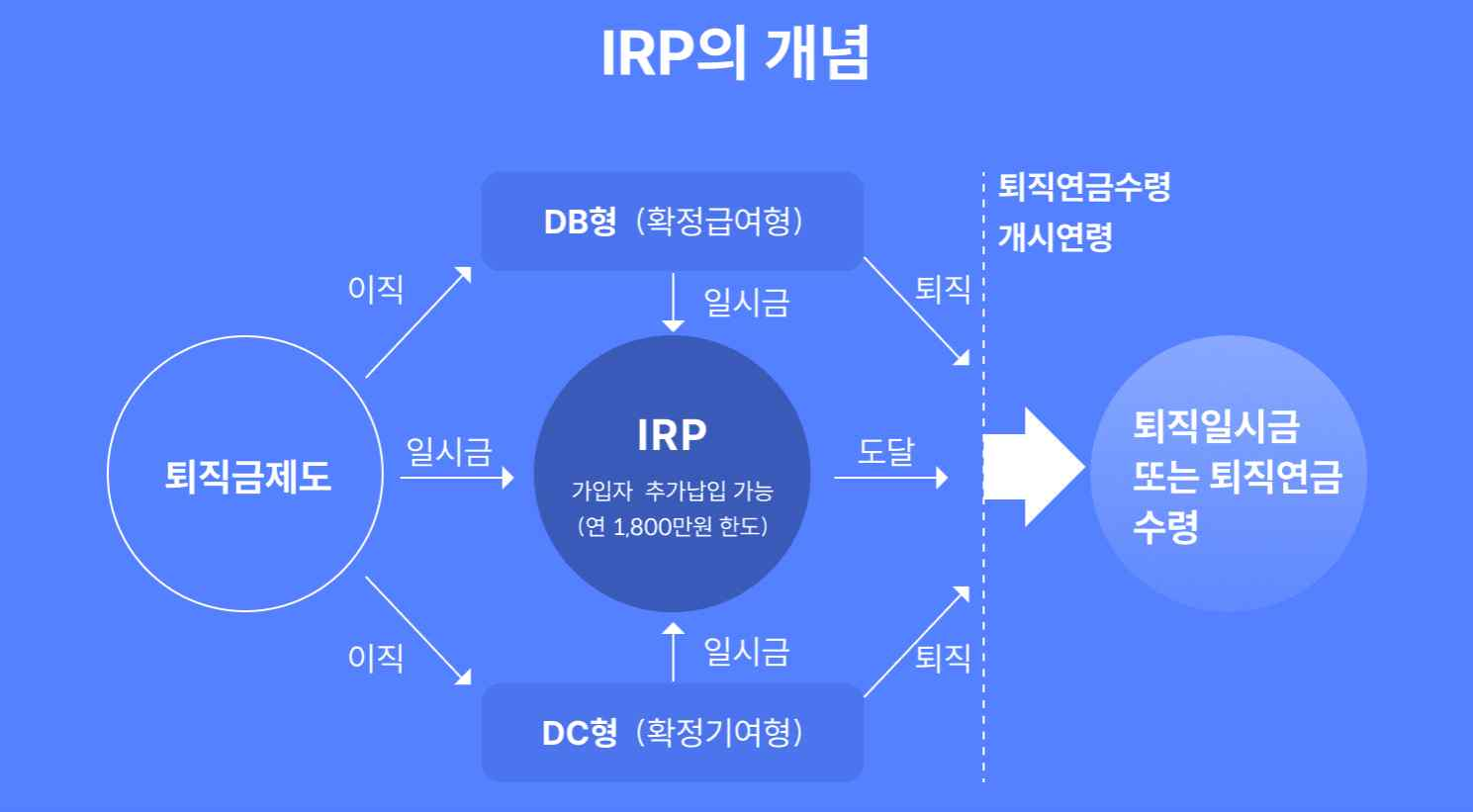 앞서 퇴직연금제도의 종류를 소개할 때 DB, DC와 함께 '기업형 IRP'가 등장했는데, 여기서 말하는 IRP와는 다른 개념입니다. 둘을 구분하기 위해 여기서 설명하는 IRP를 '개인형 IRP'라고 부르도록 하겠습니다.
