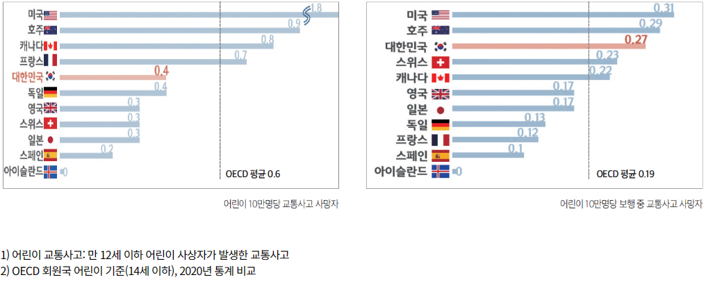 최근 10년간(2013~2022년) 어린이 교통사고는 105,768건이었으며 451명의 어린이가 사망했습니다. 지난 2022년 어린이 교통사고 사망자는 18명으로, 전년 23명 대비 5명 감소(-22%)했습니다.