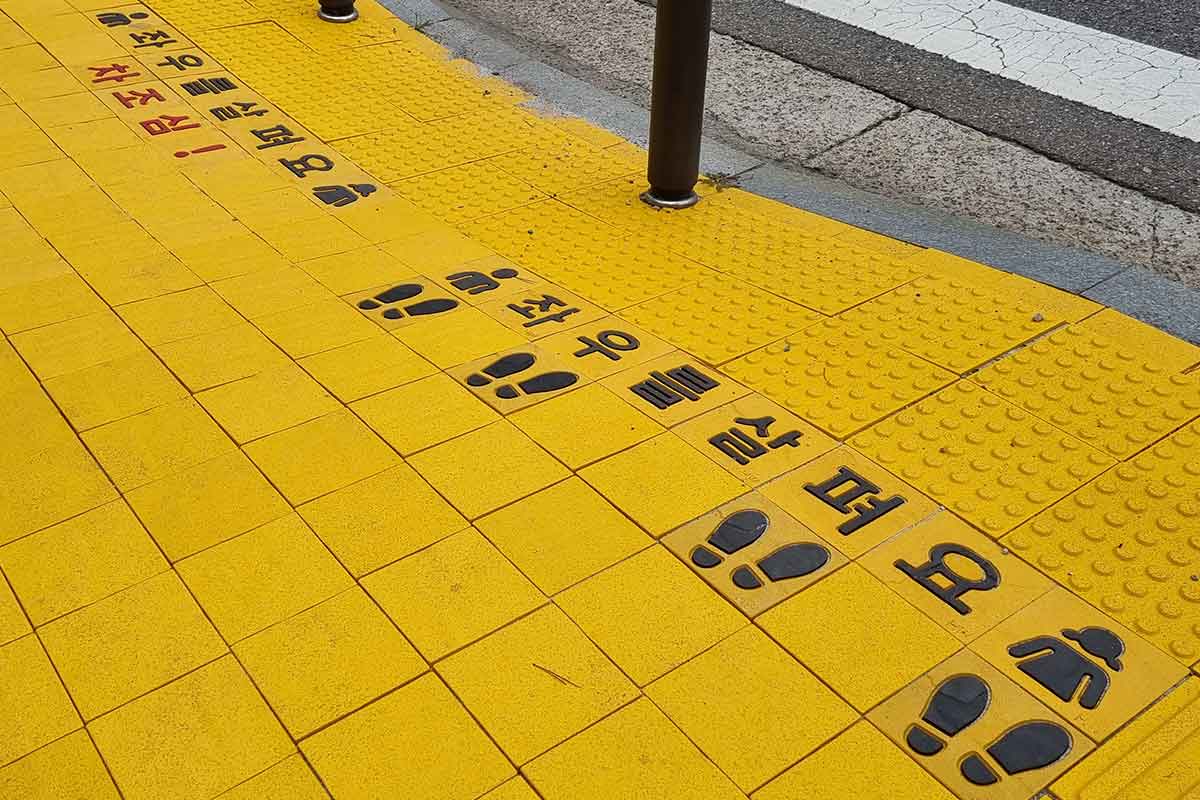 - 노란 발자국도 흔하게 볼 수 있는데, 보통 스쿨존 내 횡단보도 진입부에 설치