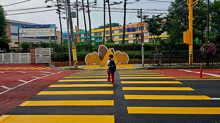 요즘 스쿨존 내 교통시설 대부분은 노랗게 물들었습니다. 신호등 커버, 단속 카메라 커버, 노면 표시, 횡단보도, 옐로카펫, 횡단보도 앞 보행자 정지라인 등 거의 모든 부분이 샛노랗습니다. 정부가 유독 '색칠하기'에 집착하는 이유는 간단한데, 바로 어린이 등 보행자의 안전 때문입니다.